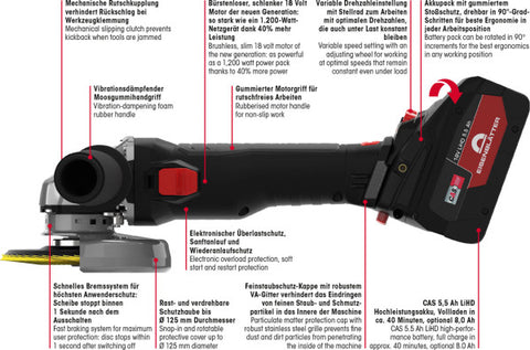 In order to noticeably increase the pulling power of battery-operated angle grinders and reduce the performance gap between them and normal power-cord-driven angle grinders, Eisenblätter offers a battery-powered angle grinder whose transmission and performance has been optimised.